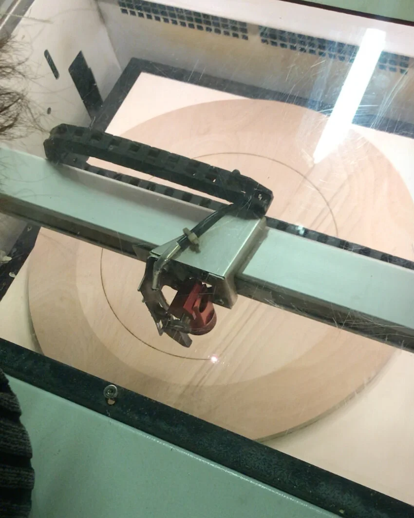 Processus: ajustement de réglages (coding avec Python et Processing) pour la gravure laser du fichier sonore sur le disque en bois de hêtre, d’après le travail open-source d’Amanda Ghassaei, avec Ada.